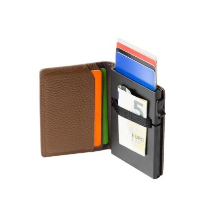 Kompakti korttikotelo yhdistää käytännöllisyyden ja tyylin. Laadukkaat nahkakannet kätkevät sisäänsä mekanismin, jonka avulla noin viisi korttia nousee esiin kätevästi sivussa olevan vetimen avulla - nopeasti ja vaivattomasti.