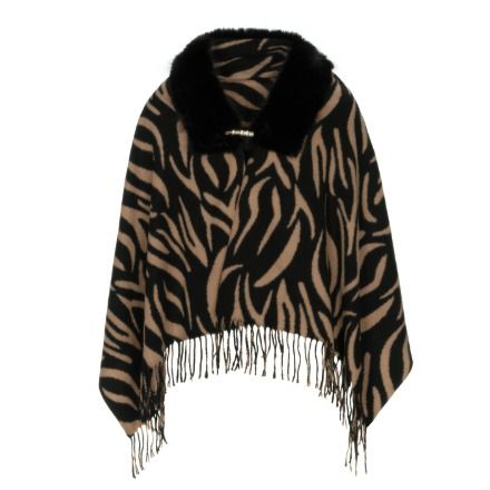Pehmeä ja tyylikäs poncho seeprakuviolla ja mustalla karvakauluksella. Kauluksessa kaunis helmillä koristettu hakaneulakiinnitys. Materiaali 100 % polyesteri. Hellävarainen pesu 30 asteessa.