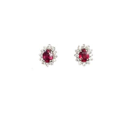 Lady Di -tyyliset upeat korvakorut, joissa hehkuvaa rubiinia ympäröivät kirkaat cubic zirkonia kivet. 925-sterlinghopeaa.
