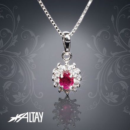 Näyttävä Lady Di -tyylinen rubiiniriipus sterlinghopeisessa ketjussa. Rubiinia ympäröivät kauniit cubic zirkonia -kivet. Ketjun pituus 45 cm.